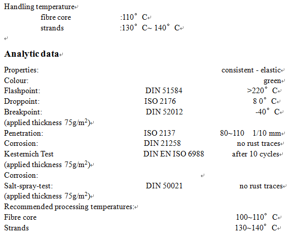 Excellent adhesive power, very good glidding characteristics, e.g. when running over pulleys, can be used in any fields e.g. for wires for cranes, fishing industry, lifts (except Koepe friction pulley cables). Balance flat ropes, balance round ropes, bobbin ropes, guide ropes, drum winding ropes. Excellent corrosion prevention, very good characteristics in salt water, also in fibre cores.